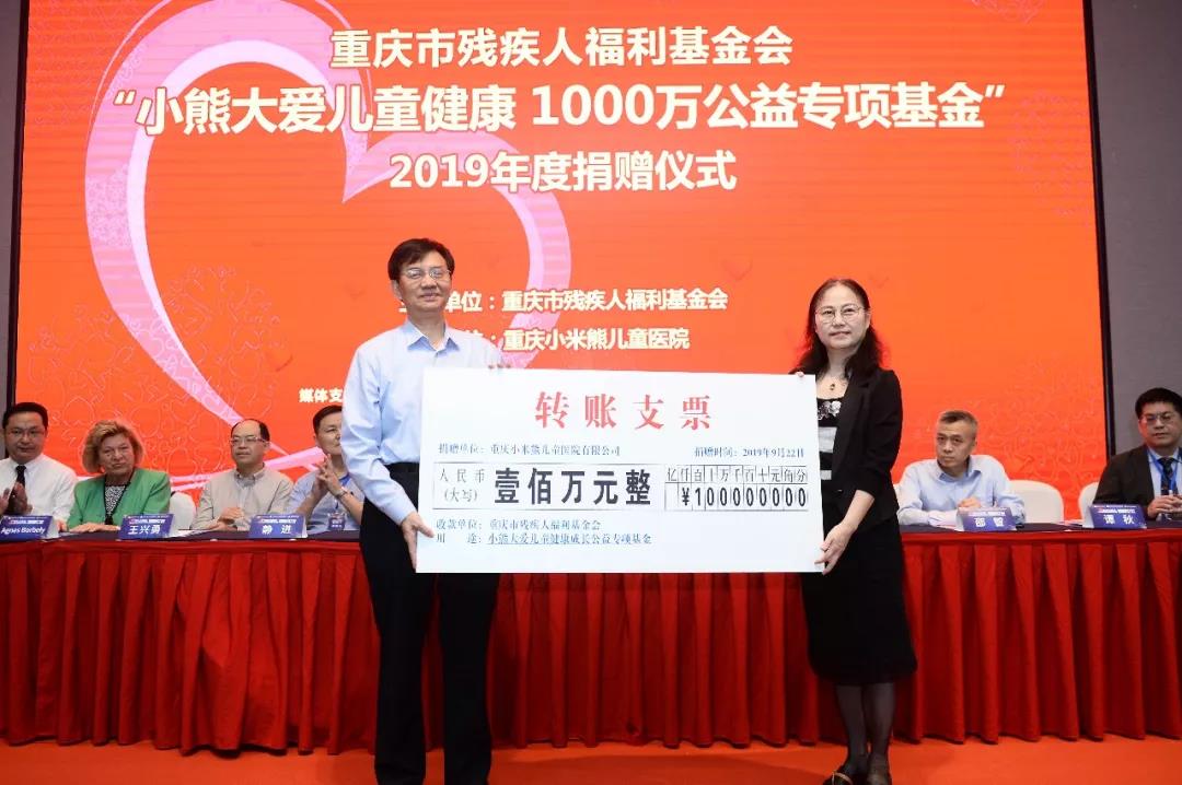 现场还举行了重庆市残疾人福利基金会“小熊大爱”儿童公益基金2019年度捐赠仪式,重庆小米熊儿童医院向该基金再次捐出了100万元善款用于脑瘫、自闭症、癫痫、精神发育迟滞(智力落后)等脑病患儿的救助。